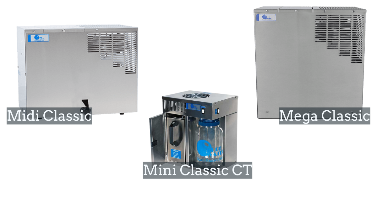 You can choose a countertop model like the Mini-Classic CT, which requires no installation and collects distilled water in a glass jar, or a larger automatic system like the Midi or Mega Classic, which stores water in a stainless-steel tank that can be connected to a dedicated faucet or your refrigerator’s ice maker/water dispenser.