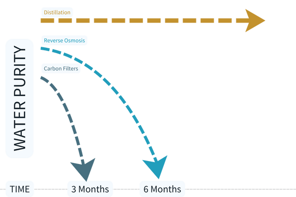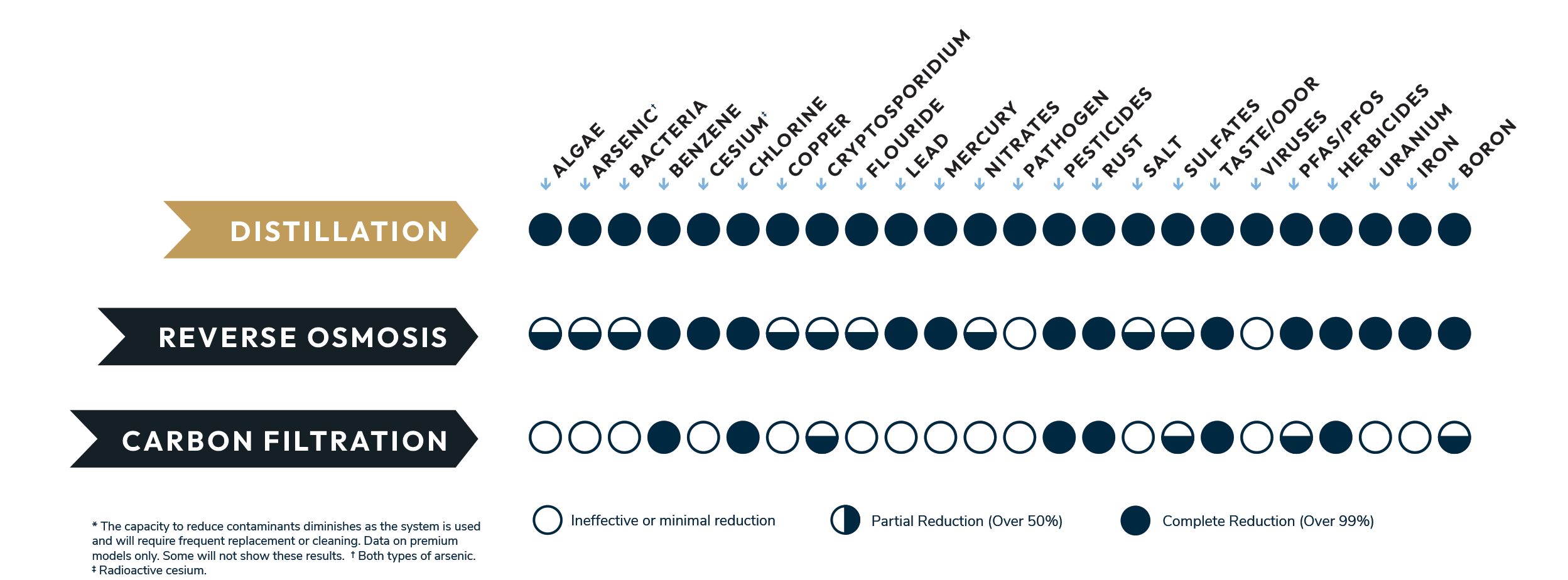 Filters trap certain contaminants but can allow smaller compounds through. Reverse osmosis can remove amounts of impurities, but has a potential for wastewater for each gallon produced. Distillation removes over 99% of contaminants and produces no wastewater.
