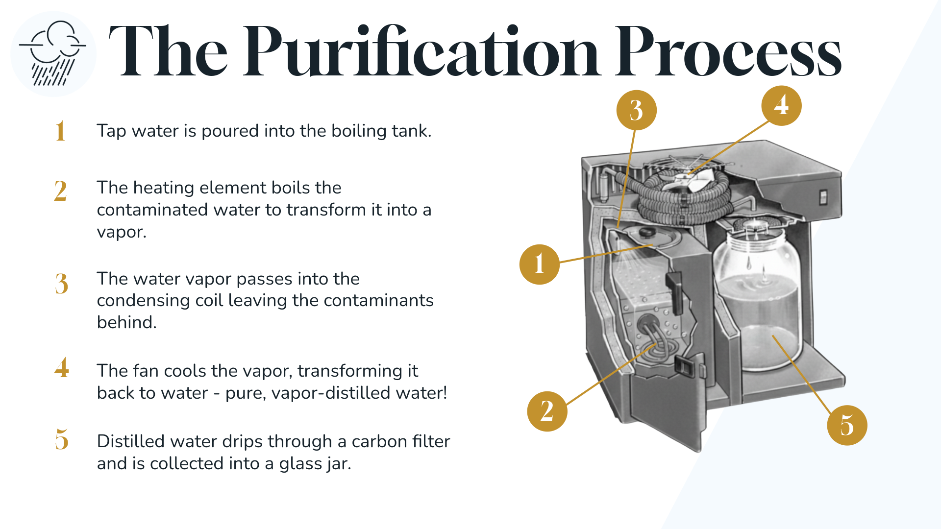 Distillation offers something unique: it separates your water from impurities through a controlled physical process. By heating water until it becomes steam and condensing it, distillation helps reduce a wide range of substances, including dissolved solids, metals, and particles, without relying on filters that degrade over time. Because you are physically transforming the water, the finished water’s composition remains consistent from batch to batch.