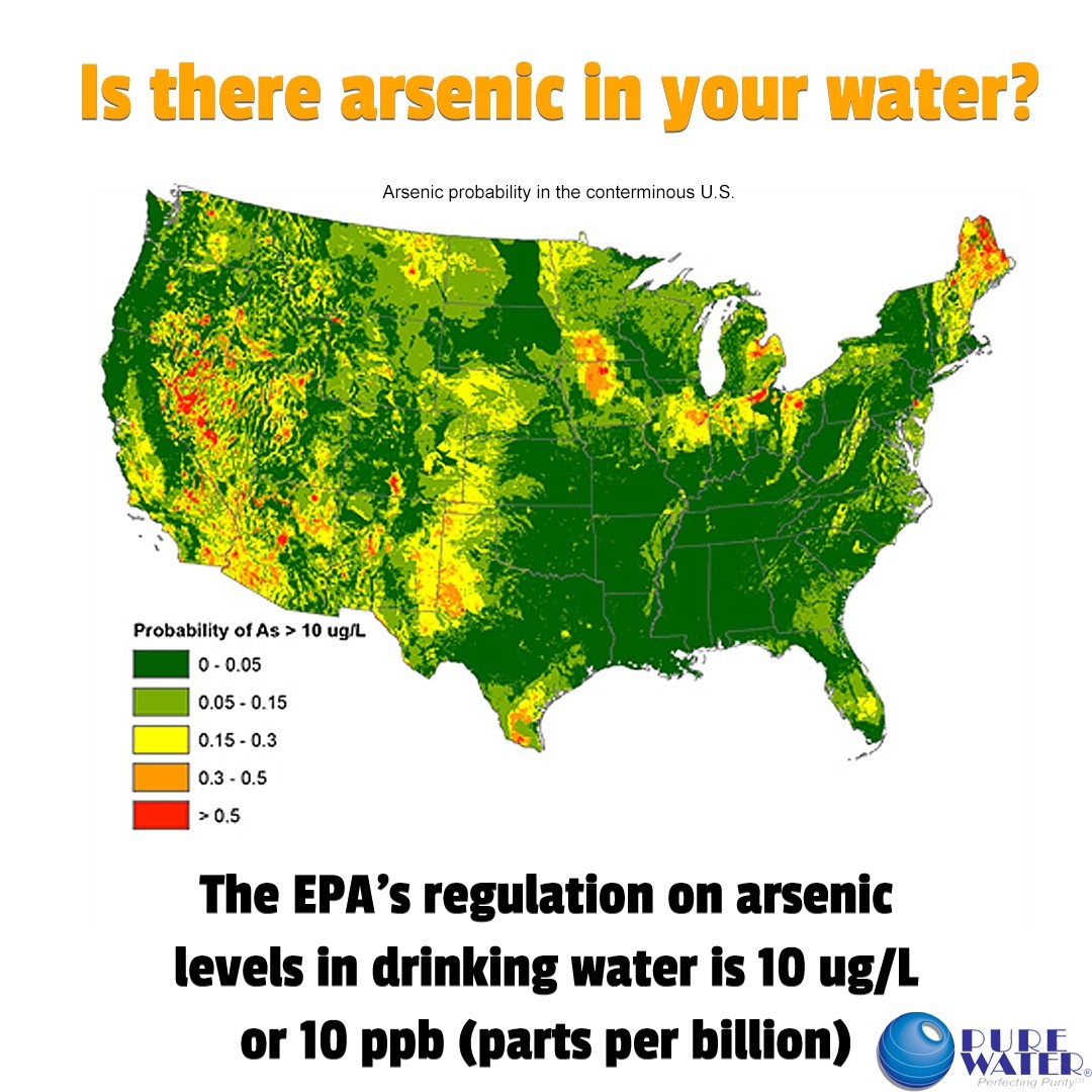 Arsenic is more likely to be found in certain geographic areas due to natural geology. In the United States, higher concentrations have been observed in regions such as: