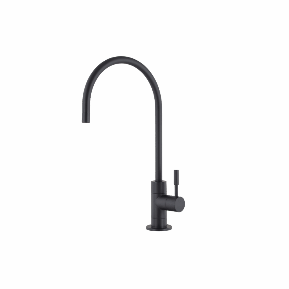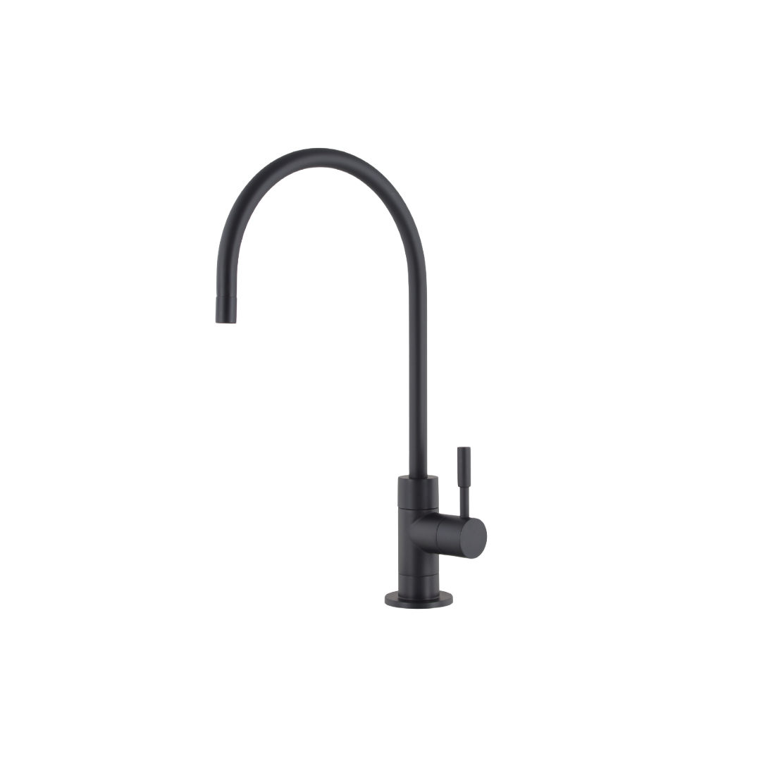 This contemporary-style faucet has a black matte finish. Looks great in any kitchen. It’s made in the USA. Features include lead-free construction, smooth operating ceramic disk, and a matte black finish. Has a high-reach, 360-degree, easy-swivel, 12” neck and non-drip protective spout. Two-year warranty.