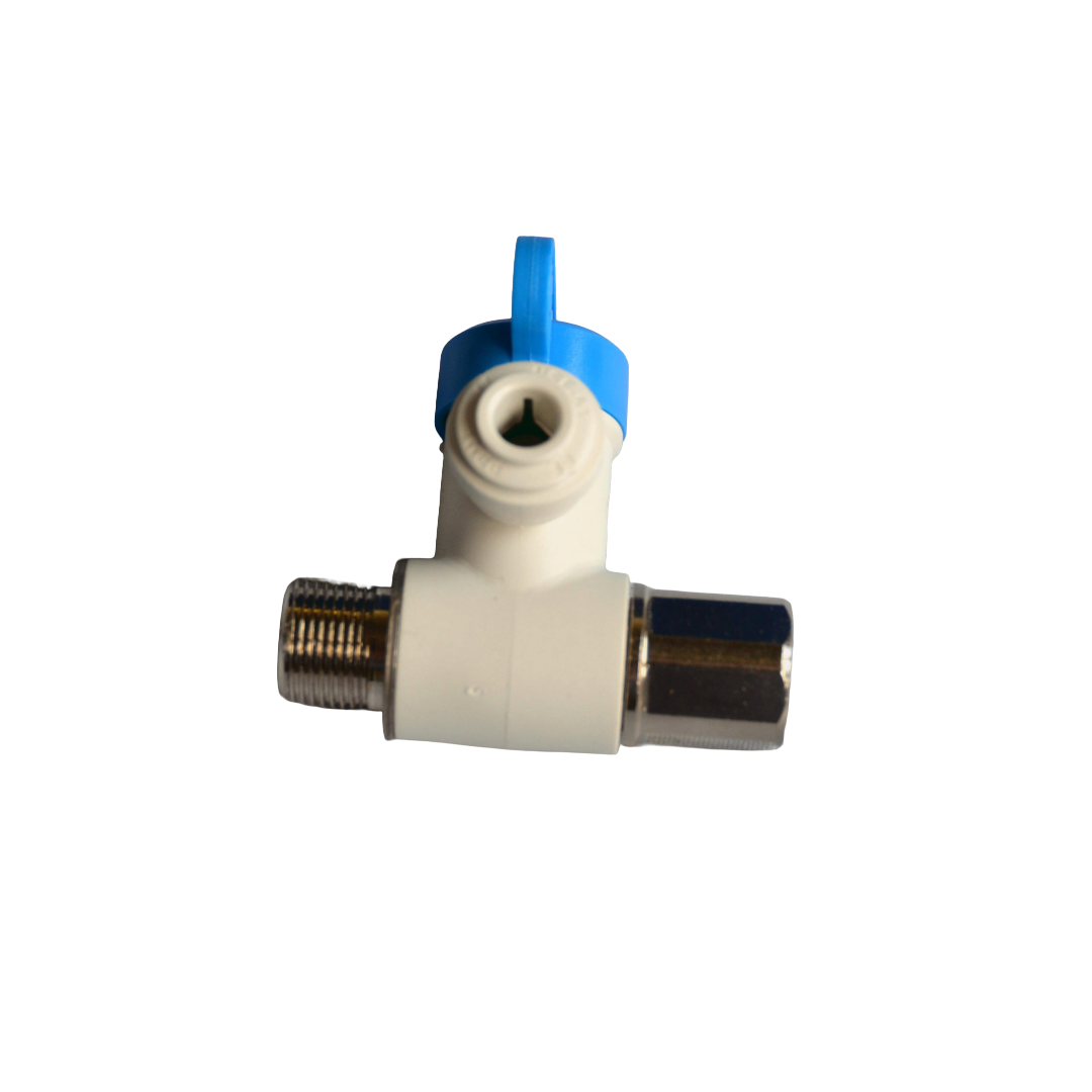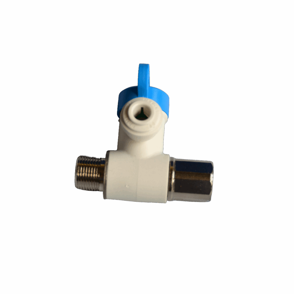 This is a fitting that connects under a standard household sink with 3/8 in. braided hose. When connected, a 1/4 in. QF ball valve allows you to run water to your raw water inlet on the distiller. 3/8″ x 3/8″ – 1/4″ Ball Valve
